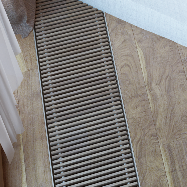 Она маскирует технические каналы в полу и придает эстетический вид помещению, обеспечивает беспрепятственную конвекцию воздуха от теплообменника конвектора, придает жесткость и прочность покрытию.