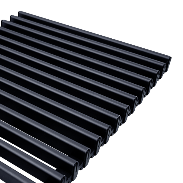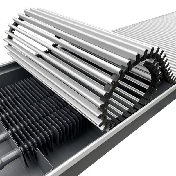 Ламели решетки сделаны из обработанного дробью анодированного алюминия и установлены на основу из полимерного материала, что позволяет избегать шума при ходьбе по решетке конвектора, который может появляться при использовании обычных алюминиевых решеток.